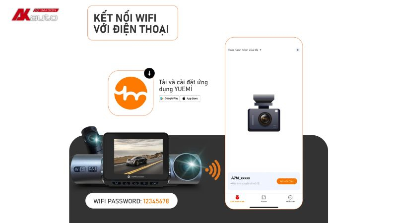 Camera hành trình 3 mắt Yuemi Q5 hỗ trợ kết nối WiFi với điện thoại thông qua ứng dụng riêng, giúp người dùng dễ dàng xem trực tiếp video, tải dữ liệu về máy hoặc chia sẻ nhanh khi cần. Ứng dụng được thiết kế với giao diện tiếng Việt trực quan, thao tác đơn giản, phù hợp ngay cả với người dùng lần đầu sử dụng camera hành trình.