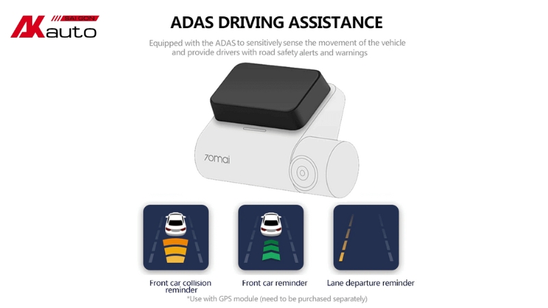 Camera hành trình Xiaomi 70mai A500S được trang bị hệ thống cảnh báo ADAS thông minh, hỗ trợ người lái trong quá trình di chuyển. Thiết bị có khả năng cảnh báo va chạm phía trước, nhắc nhở giữ khoảng cách an toàn với xe đi trước trong khoảng 7 – 10 mét. Khi phát hiện phương tiện bất ngờ tạt đầu hoặc nguy cơ xảy ra va chạm, camera sẽ phát cảnh báo, giúp người lái phản ứng kịp thời và hạn chế rủi ro.
