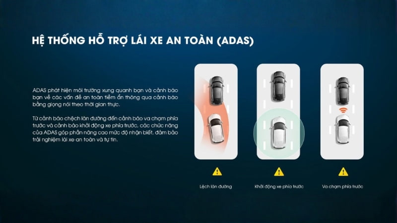 | ADAS | Cảnh báo nguy cơ va chạm, phát hiện lệch làn và xe phía trước di chuyển | Hỗ trợ cảnh báo va chạm và cảnh báo lệch làn đường trong quá trình lái xe |