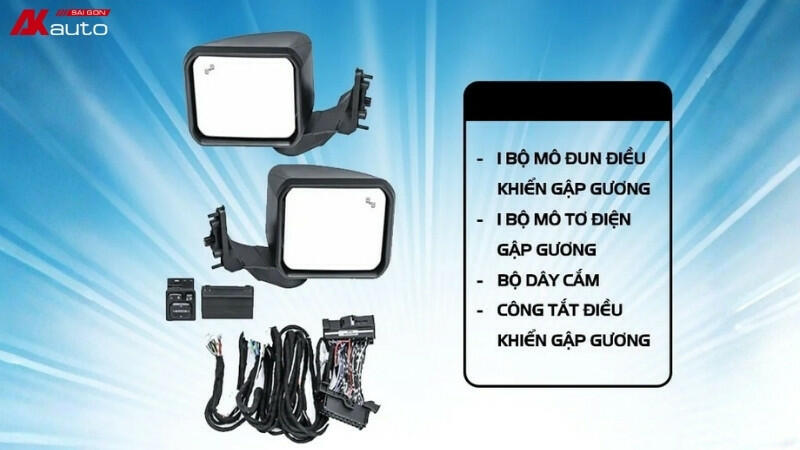 - Bước 1: Kiểm tra tổng thể xe và chuẩn bị trước khi lắp đặt: Kỹ thuật viên kiểm tra tình trạng xe, chuẩn bị đầy đủ dụng cụ lắp đặt và bộ gương điện với đầy đủ các mô – đun, dây dẫn, giắc kết nối, công tắc điều khiển.