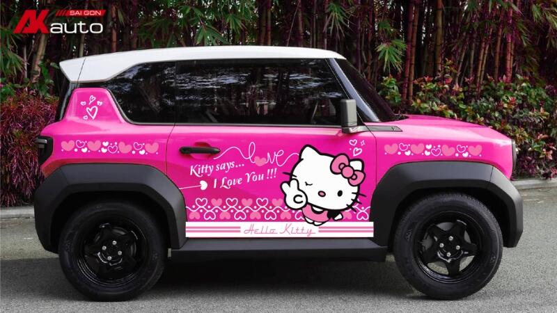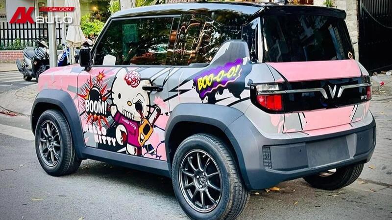 Lựa chọn kinh điển của phái đẹp chính là phong cách VF3 độ Hello Kitty. Sự kết hợp giữa tông màu hồng, trắng và biểu tượng mèo Kitty không bao giờ lỗi mốt. Trên form xe vuông của VF3, mẫu decal này tạo nên sự đối lập thú vị giữa nét góc cạnh của xe và sự mềm mại, ngọt ngào của họa tiết, giúp xe trở nên cực kỳ duyên dáng.