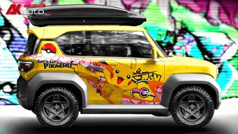 Mẫu tem Pikachu được dán trên VinFast VF3 màu vàng, tạo sự đồng bộ và nổi bật về màu sắc tổng thể. Hình ảnh Pikachu kích thước lớn kết hợp cùng các dòng chữ “Let’s Go! PIKACHU” và “Pokemon” trở thành điểm nhấn chính ở phần thân xe. Các họa tiết tia chớp và quả cầu Pokeball được phối hài hòa với tông đỏ, vàng và đen, mang đến diện mạo trẻ trung, năng động và thu hút cho chiếc xe điện.