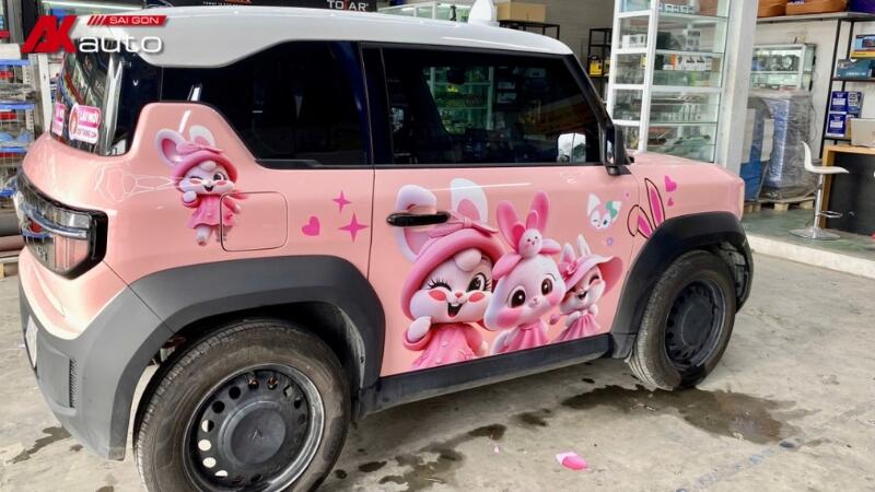 Mẫu tem tai thỏ mang đến diện mạo tinh nghịch cho xe điện mini. Điểm nhấn nằm ở chi tiết tai thỏ cách điệu đặt tại gương chiếu hậu hoặc cột A, kết hợp cùng các đường nét mảnh chạy dọc thân xe. Phong cách VF3 độ tai thỏ giúp chiếc xe trở nên trẻ trung, phù hợp với những người dùng yêu thích sự khác biệt nhẹ nhàng khi di chuyển trong đô thị.